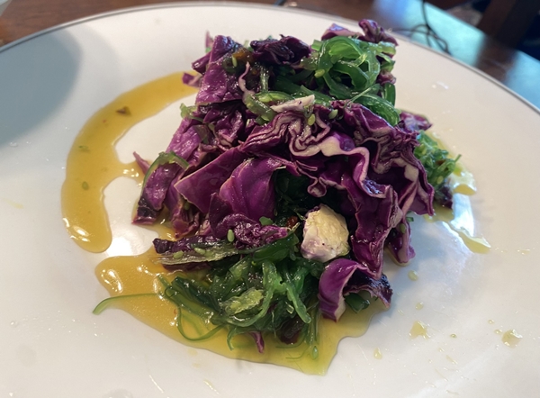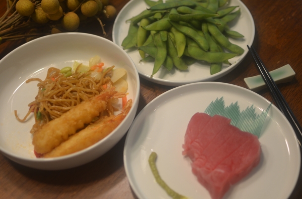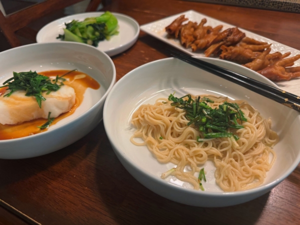 我更喜欢这样的中式:清蒸智力sea bass,炒小青菜,葱油拌面,底下的葱是黑色的(细细的小葱是朋友中国带回来的种子,真是香)