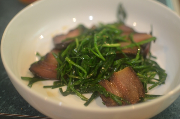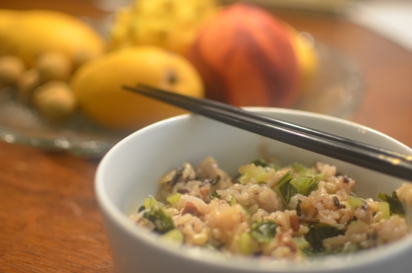 腊肉和莴笋叶(青菜的皮也行,菜心留着另外炒)做的菜饭,香!