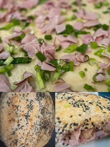 1. 300克面粉加180克水再加少许的糖和酵母搅拌成团发酵二倍大。 2. 把面团擀成圆薄片加油抹一下后加盐、葱和ham 。3. 把加好料的圆薄片切一刀慢慢卷起来成圆锥体 。 4. 压扁擀成圆饼表面涂抹水加些芝麻。 5. 锅热加油,把圆饼放入锅中煎一下后加少许水后盖上盖子。 6. 等锅里水收干后翻面再煎至金黄色就可以出锅了。