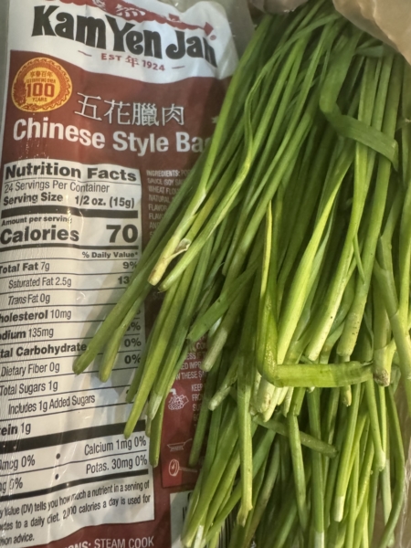 超嫩的刚从地里割的韭菜,炒Costco的五花腊肉,把油逼出来,韭菜味道就很好吃,瘦腊肉也是我的最爱,当然不能多吃。一包有两袋,每次切一块就行。