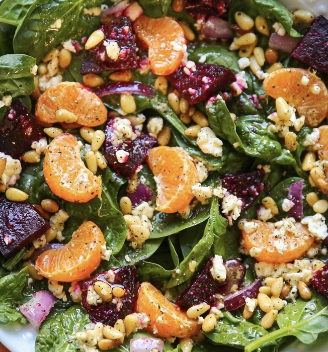 这个是女儿平时在她自己家喜欢做的色拉,可以用我烤好的红菜头组合。放烤好的松籽,橘子罐头,菠菜,放一点胡椒粉,撒上一点点cheese 。油醋汁。