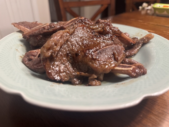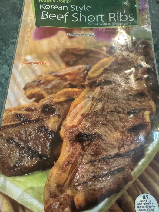 给大家介绍一个Trader Joe's的牛仔骨,虽说是红肉,但一共没多少肉,味道也不错,里面还有五片,价位不错,是韩国口味的,稍甜,所以我煎的时候(可以不放油)放了一点点酱油。
