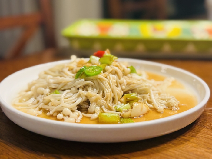 拌双菇,用耗油调的汁。感觉拌有时味道更好一点,尤其是金针菇。菇水里先焯一下。