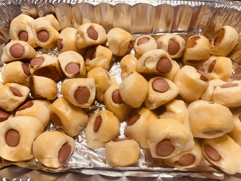 我给美国人做了春卷,给中国朋友做的香肠小面包也挺受欢迎。还有大家带的好多煎饺,凉面,凉菜,寿司,美国人做的pot pie, 各式甜点,餐馆订的中国菜等。。。。
