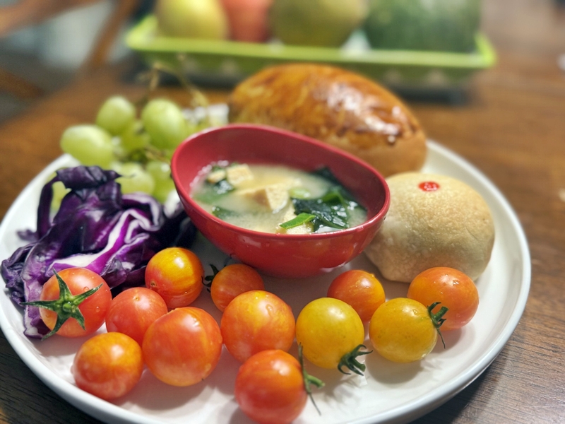 前一天吃的,朋友种的这种有点粉色的小番茄比我种的好吃。自己做的肉松面包,月饼。