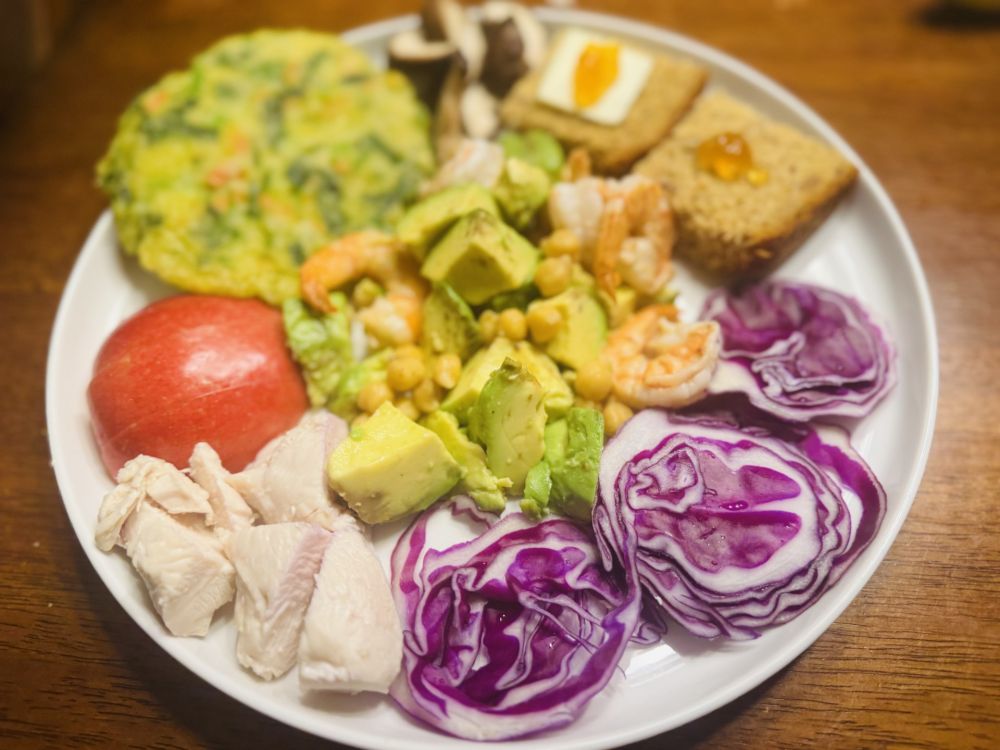 鹰嘴豆,牛油果,虾色拉,山寨日本餐馆吃的香菇冷菜,多籽健康面包,鸡胸肉,紫甘蓝。