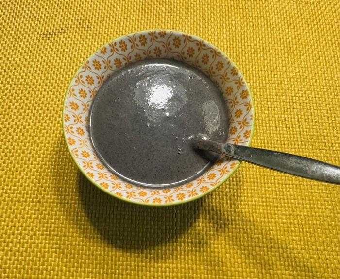 这个是自己做的鹰嘴豆芝麻糊,煮熟打碎,放一点点蜂蜜,很好喝,跟朋友学的。东方店的芝麻糊卖得很贵,还没我的健康。