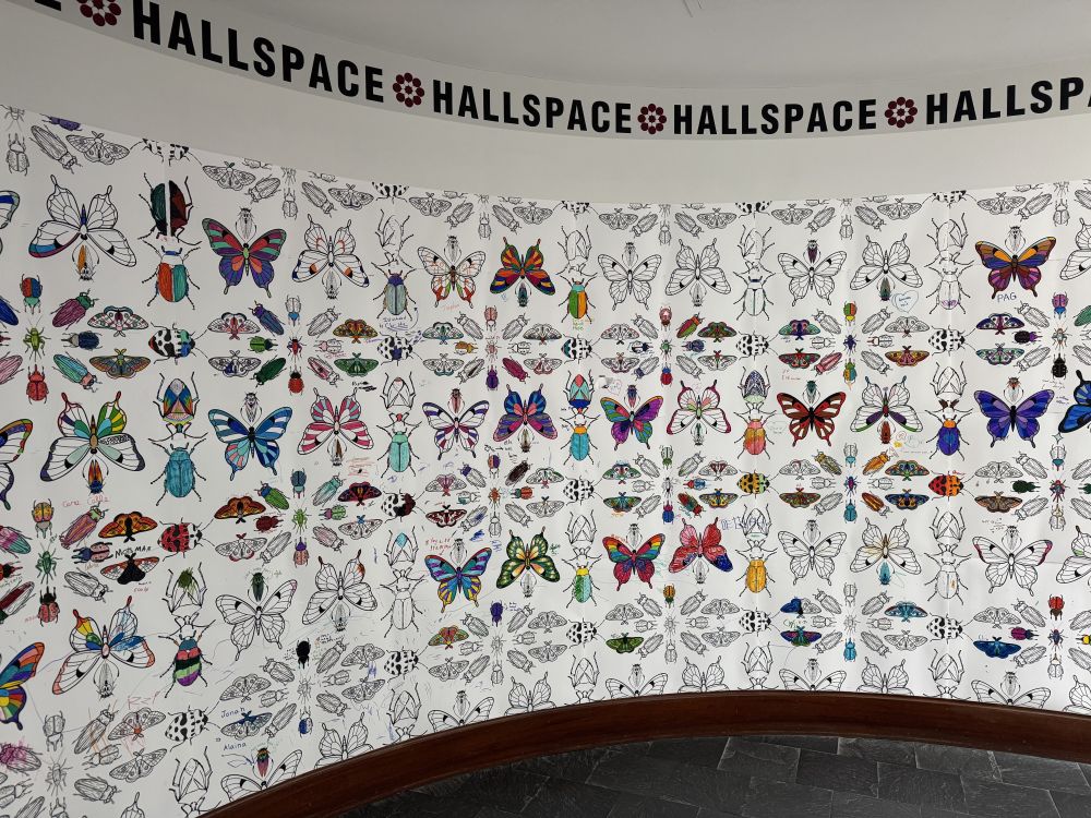 从展室出来才发现,那幅巨大的昆虫画原来是供参观者涂色的。旁边的小桌上放着一桶彩色笔,邀请大家自由上色。这样的互动设计真好,让观众不仅是欣赏者,也成了创作者的一部分。