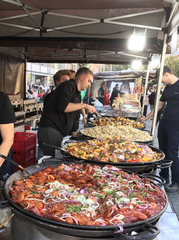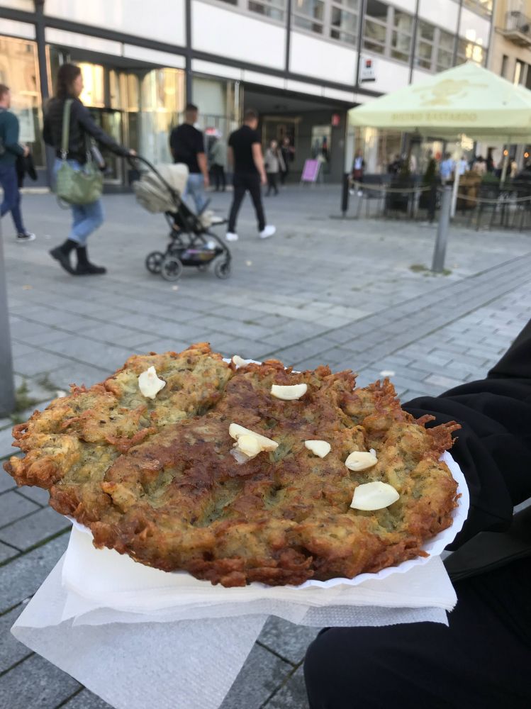 广场另一角人声鼎沸,原来是个露天美食市场。烤肠滋滋作响,甜点摆得漂亮,啤酒摊更是一字排开。买了块刚出锅的油饼,摊主热情地拿起蒜头在饼上用力擦了两下,竖个大拇指。咬一口,蒜香混着油香。决定,等会儿就来这儿吃晚饭!