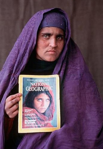 这是美国《国家地理》杂志上最有名的人物照片之一,取名叫“阿富汗女孩”。这是美国记者史蒂芬-麦卡瑞1984年在阿富汗难民营里拍摄的;那时候,这个女孩大约12岁。当时麦卡瑞没有问这个女孩的名字。