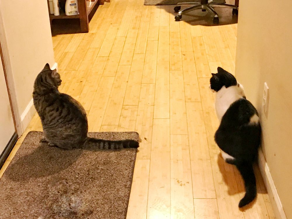 麻麻一直认为两个喵星很不给面子,只要麻一举起手机她们不是扭头看别处就是跑掉了,所以麻也就不费那心思去拍她们。大冬天的外面总是下雨,两个小冤家没别的去处,就天天在家里较劲。看到了吗,咪咪又发现有情况了。