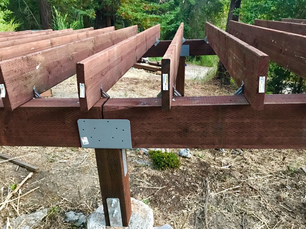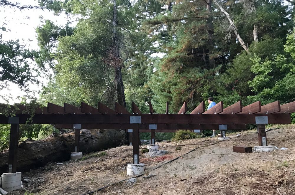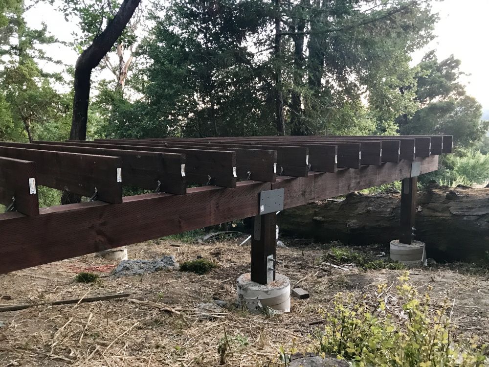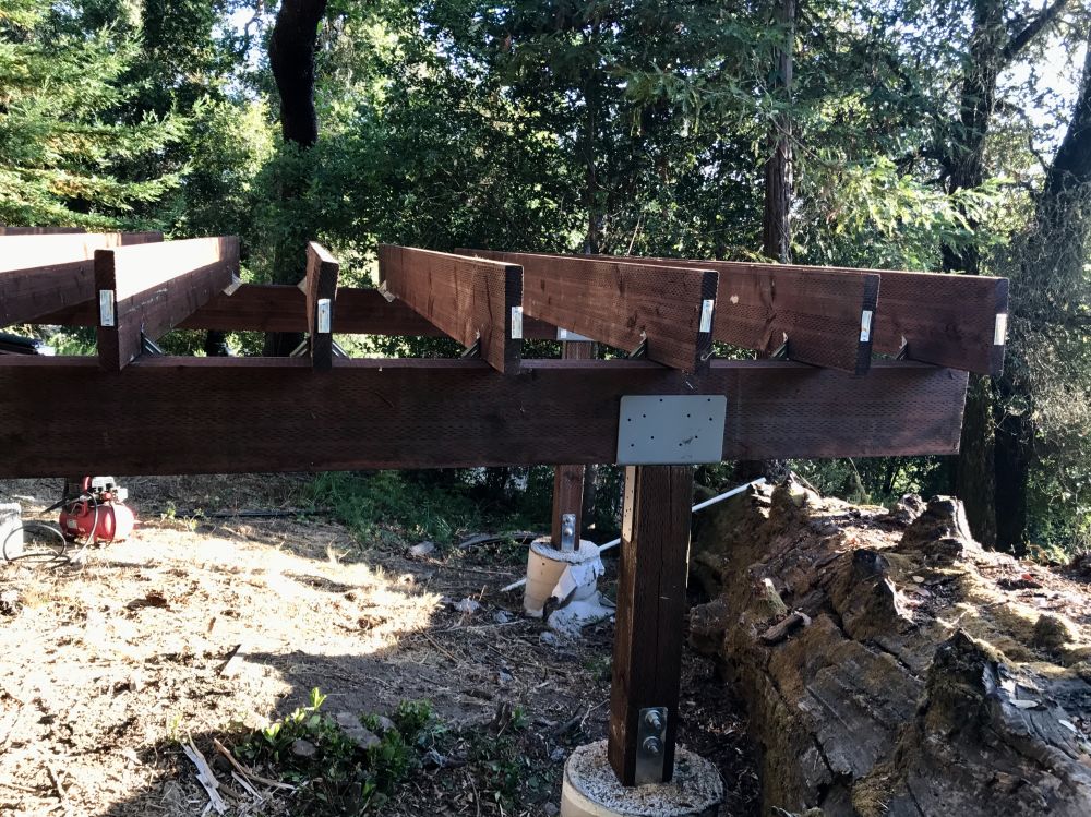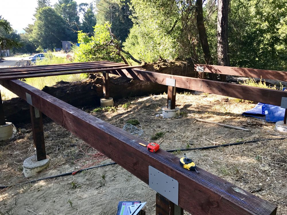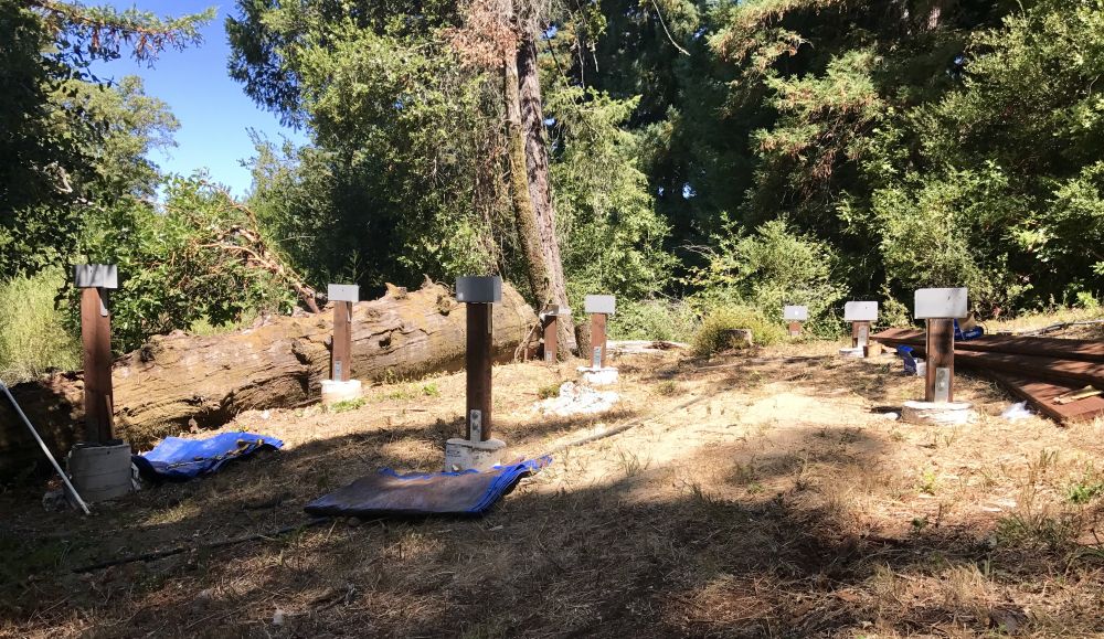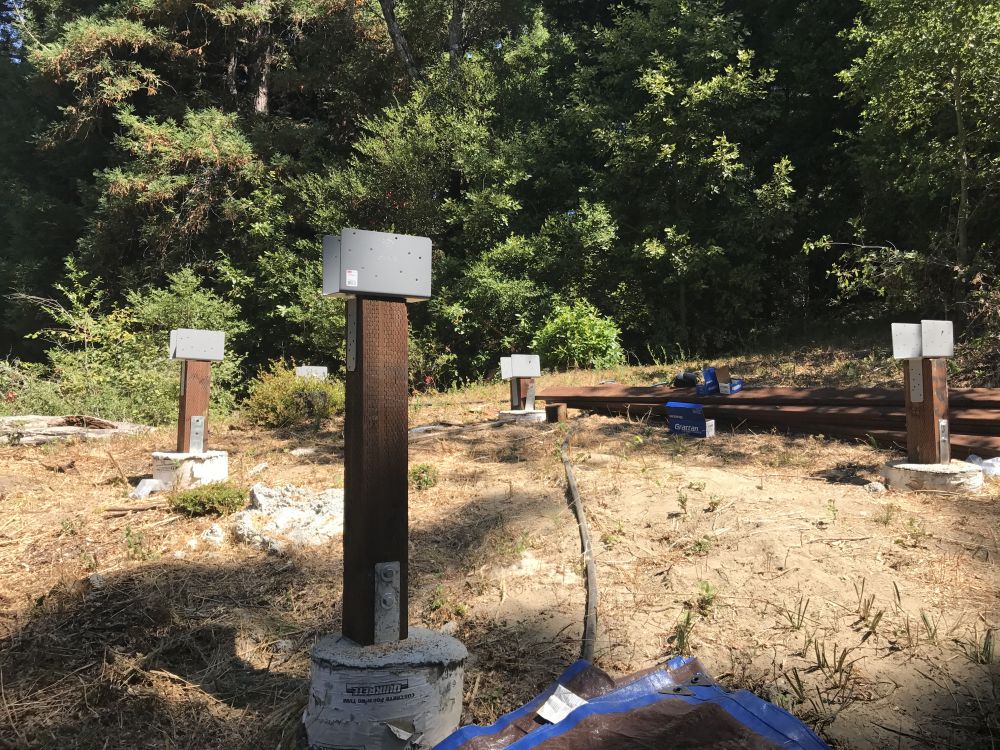 一直想建个小木屋当办公室书房什么的,还想有点浪漫情趣,所以地点就选在这个居高临下的小坡上了。去年把树砍了,今年才开始建。桩子是请人来打的,剩下的都自己干。这是今天的进展。