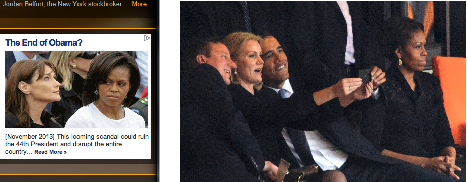 再说奥巴马的“色色”行为。以前,奥巴马就曾被记者拍到很多“色眯眯”的行为,比如偷看法国总统萨科齐夫人,与泰国和乌克兰美女总理的暧昧眼神和互动等。据说每次都引起第一夫人米切尔打翻醋坛子。但是,奥巴马本性难移,这次又在全球政要面前,在众多镜头面前,当着米切尔的面,与丹麦金发美女首相玩自拍,视米切尔为无物。难怪米切尔一脸怒气(还好没有当场发作),看米切尔那愤怒的眼神和奥巴马快乐的神情(下图)。