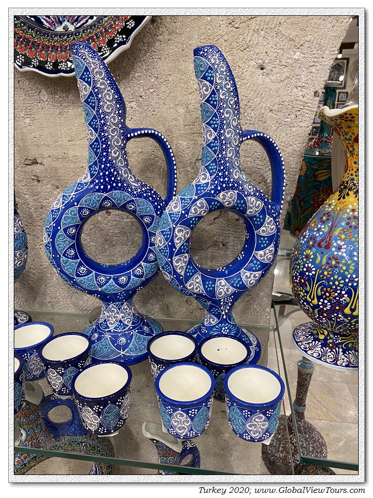 下面是陶瓷的传统宫廷酒具。大家都知道,穆斯林是禁止饮酒的。但是,在土耳其,几乎人人都喝酒。而且土耳其的“国饮”,是一种有大料(八角)香味的烈性酒。也许是游牧民族突厥人的传统,就像蒙古人一样,是好酒的民族。尽管后来改信伊斯兰教,但是传统未改。