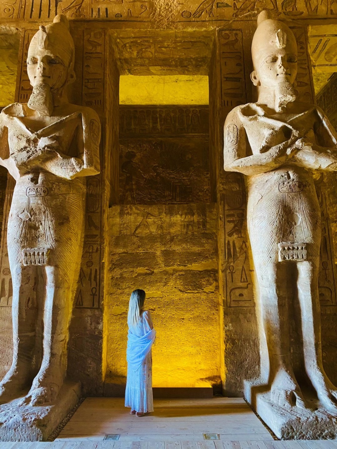 神庙建于3200年前,有精确的计算和设计。中央大厅底部的雕塑,四个塑像并排而坐,从右向左依次是主管宇宙天空的神灵,拉姆西斯二世本人,古埃及最重要的太阳神,黑暗之神。每年的2月21日(拉姆西斯二世的生日),和10月21日(拉姆西斯二世登基之日),太阳升起的时候阳光直射到神庙底部,照亮四座塑像的右侧三个。最左侧的黑暗之神依然在黑暗中。精准的计算令人惊讶。那是3200年前,古埃及人就有如此精准的计算,文明程度令人心仪。