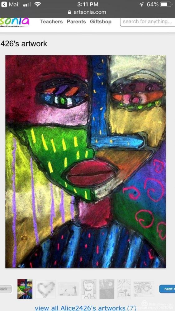 最近一段时间,老二都一直想做一个Artist,那天她跟爸爸讲:“ 等我长大了,我要到小学教孩子们画画。”“哇,你真了不起。” 她爸爸夸奖到。还别说,老二确实挺喜欢画画的,我昨天收到老二的作品,怎么看都觉得点儿意思。也许,老二真有艺术家的天赋也未可知呢。