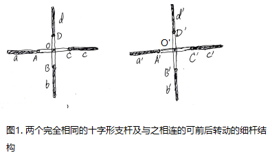 图1中是两个完全一样(画得不好,请大家发挥想象力)的十字形状支架子及与之相连的细杆结构。每个架子的支杆都可绕其中心(O或O’)转动。每个支杆的端点(A,B,C,D或A’,B’,C’,D’)都链接着一根与支架的杆子同等长度的细杆。每个细杆都可绕与支杆之间的链接进行前后转动,但不能在与所连接的杆子垂直的方向移动。这两个支架系统的选材要满足这样的条件:支架的材料要质量轻但强度大,不易变形,而与支架相连的细杆则要求质量大,也不易变形。这样就可以保证在转动过程中系统的惯性由细杆决定,而支架只是起到连接细杆以及实现转动的作用。