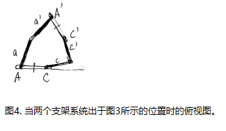 然后,我们将两个支架系统相邻直立着,并两个支架的垂直平面之间有个60°的夹角,并且将细杆a与a’,b与b’,c与c’,d与d’相互链接。那么当支架的A,B,C,D以及A’,B’,C’,D’处于图1中的正面位置时,除了c与c’之外,其中的a,b,d以及a’,b’,d’就不会处于图1中的位置。图2是当支架的A,B,C,D以及A’,B’,C’,D’处于图1中的正面位置时的俯视图。其中的虚线代表b,d和b’,d’细杆的位置。