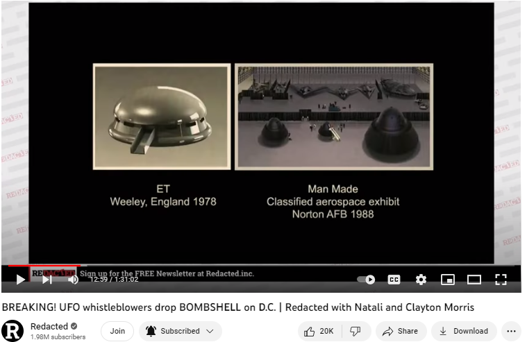 而这里要说的故事是发生在6月13日Clayton的直播中的故事。Clayton的节目每次都分成好几个专题。在6月13日的第一个专题就是关于UFO的,在那个专题的时段里,女主播(Clayton的夫人)Natalie的情绪特别激动,当Clayton对观众的评论进行回应时,她大声打断了他,随后两人发生了我从未在他们的节目中见过的激励交锋的火爆场面,可以说已经超出了任何一个直播节目中的两位主持人之间通常会发生的交锋。。。。但事后在他们贴出的该日的直播视频中,那段交锋全被删除,在UFO主题段的结尾是Natalie的甜蜜的笑容和Clayton对观众的温馨感谢,好像什么不愉快都没有发生过似的。只有在末尾Natalie讲述与2014年她在白宫采访拜登夫妇相关的故事时,Clayton才又语含玄机地稍微刺了她一句,而她也很快地回了一句,其间两人都面带笑容语气温和,不细心根本品不出其中的微妙。