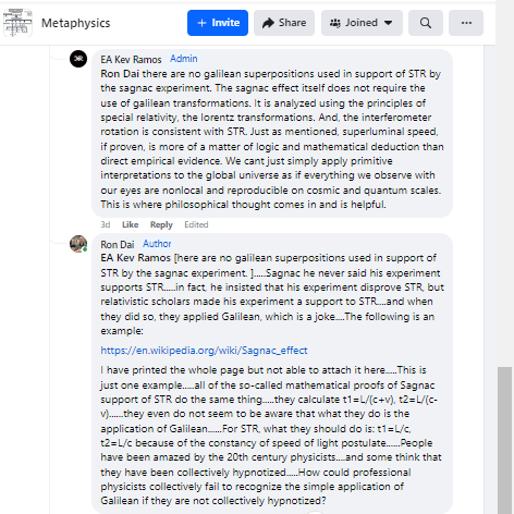 前面提到我在脸书群组和那位管理员的对话,一开始他还信心满满地维护狭义相对论,但是当我把相对论学者们用伽利略叠加来证明Sagnac实验支持狭义相对论的证据指出来后,他就不再出声了,也没再回复我提出的主流物理学界是否被催眠了问题。。。。。。: