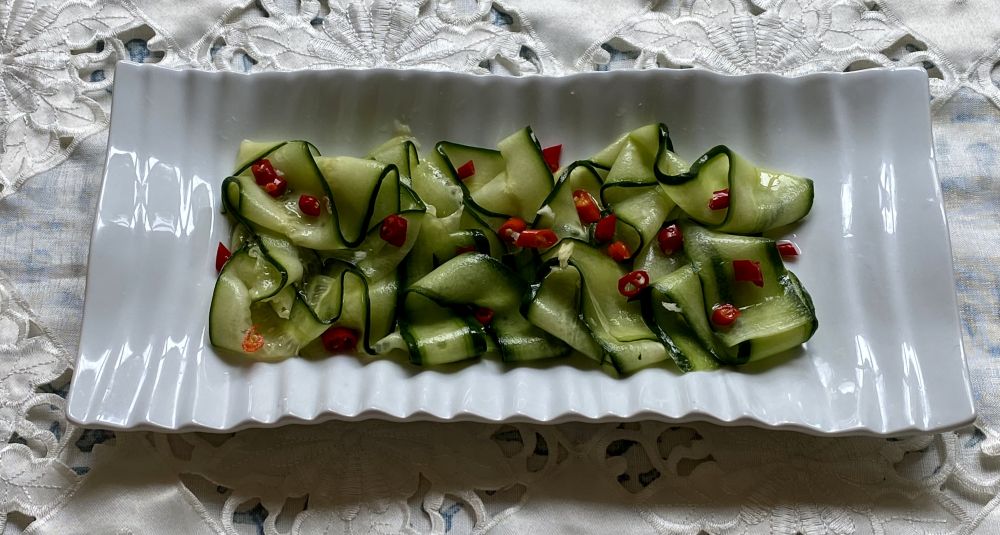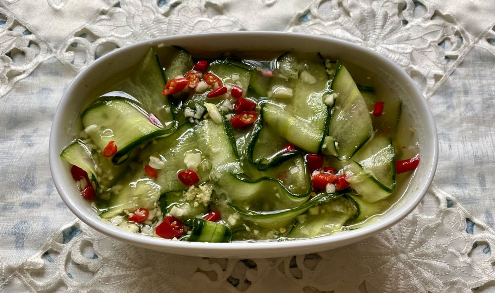 黄瓜片成一片片长条,加盐,糖,蒜,醋,倒入雪碧泡上.