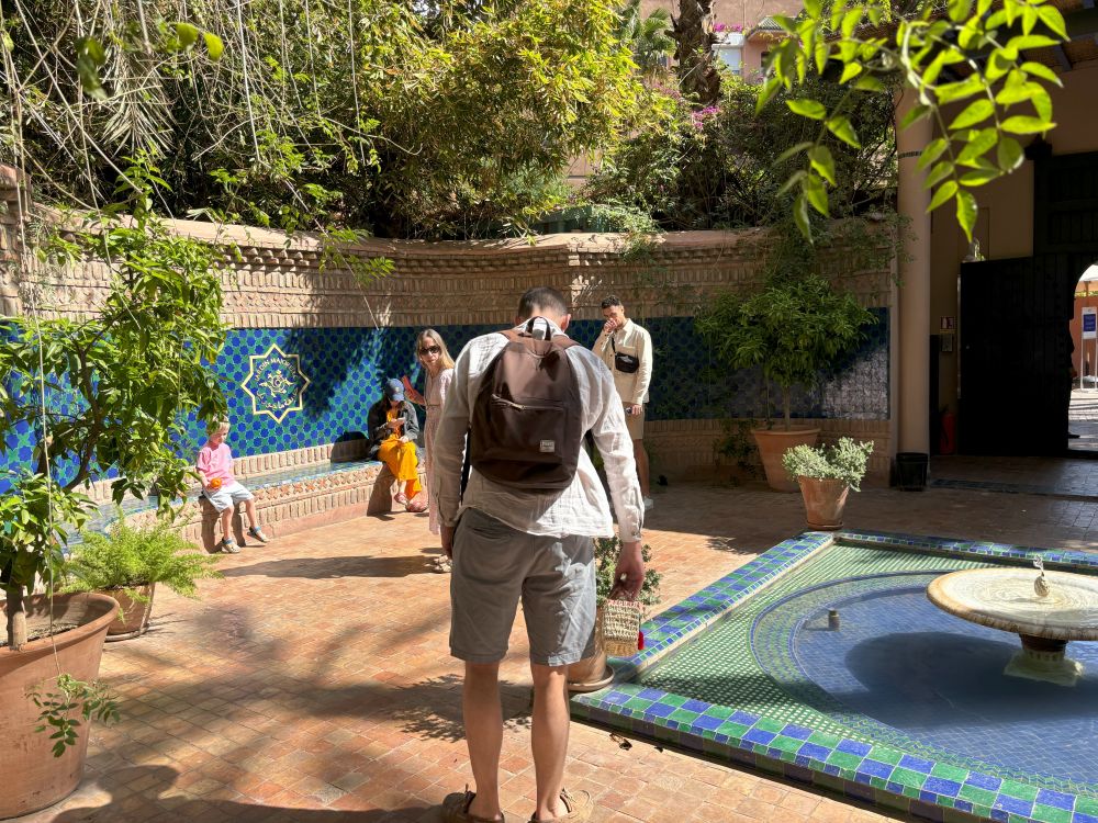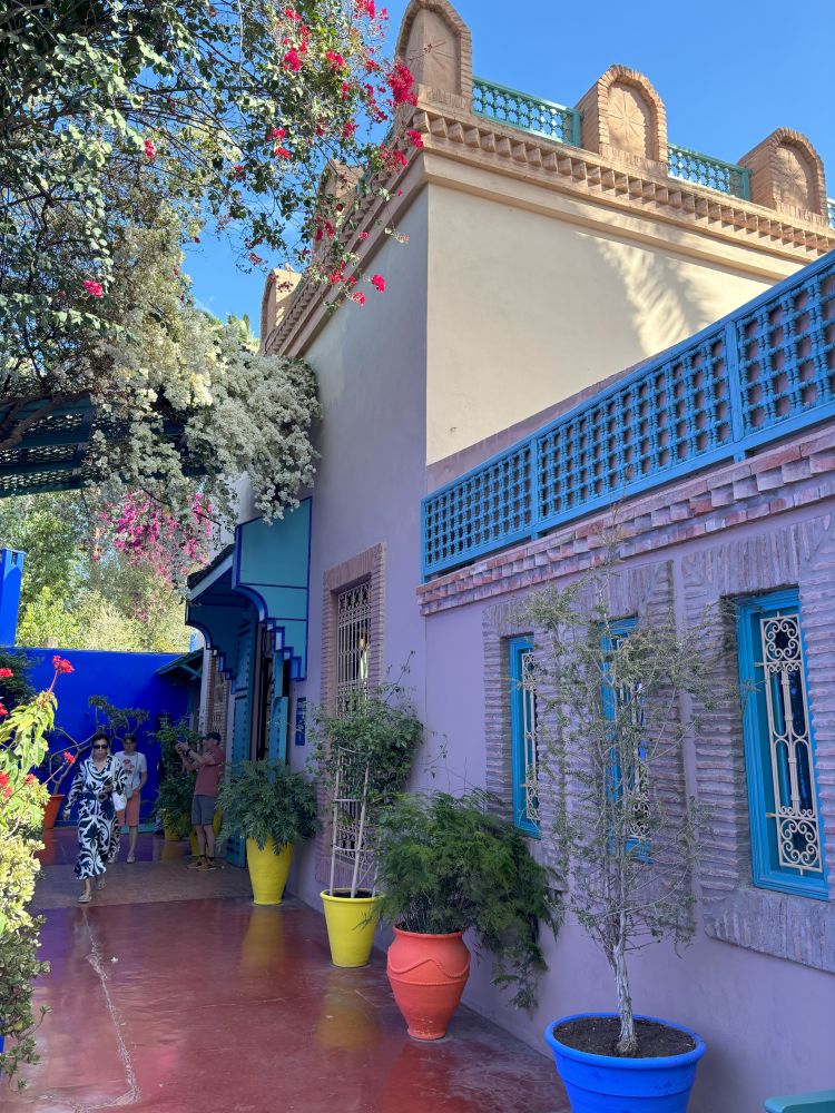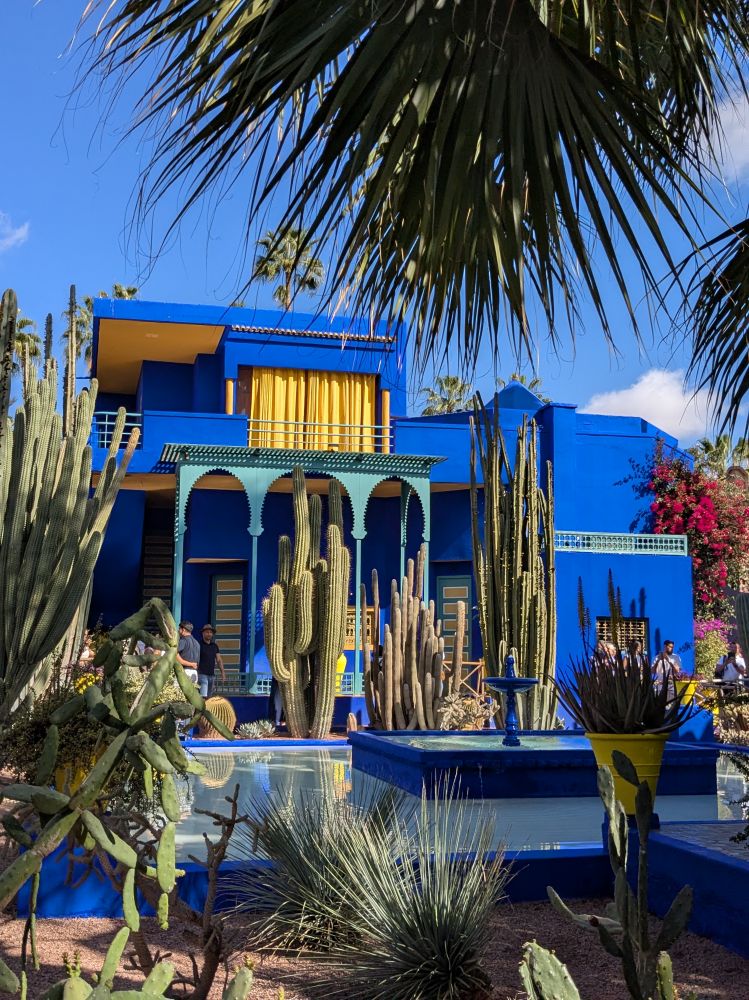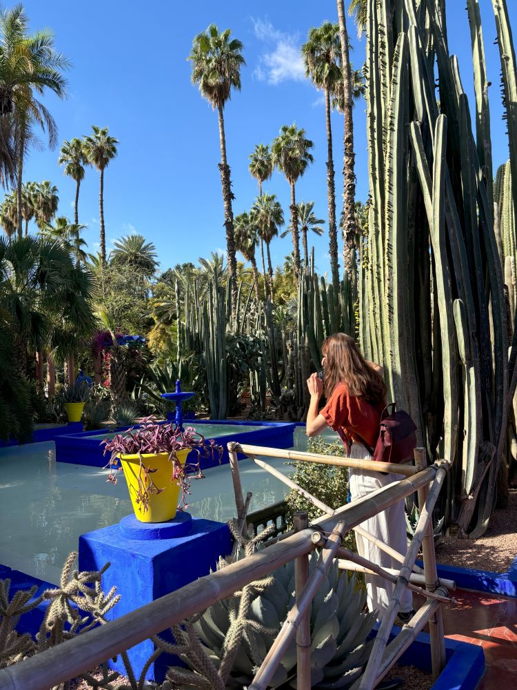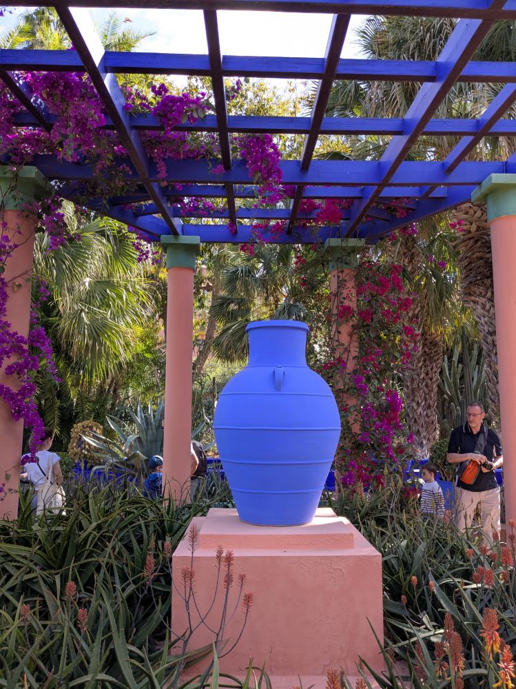 走进马拉喀什的Majorelle花园 ,仿佛进入了一个色彩斑斓的世外桃源,连空气中弥漫着宁静和艺术气息。花园完美结合了法式装饰艺术和摩洛哥风格,浓郁的蓝色,浅绿色的柱子,明黄色的窗框,红色的人行道,还有来自世界各地的植物,包括不同种类的仙人掌,棕榈树和竹子,强烈的对比而又那么和谐。这里曾是法国画家雅克·马若雷勒(Jacques Majorelle)的私人花园,后来被伊夫·圣罗兰(Yves Saint Laurent)收购并修复,成为摩洛哥最受欢迎的景点之一。为了避开游人高峰,我们特意购买了早上8:30的门票,到达公园时已有不少人了,等待拍照的游客排着长长的队伍。