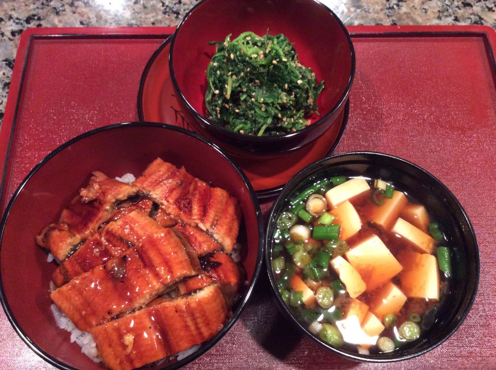 地主今日晚餐:鳗鱼盖浇饭,菠菜芝麻色拉,豆腐大酱汤。奢侈一回,以后少吃,希望鳗鱼能回归。