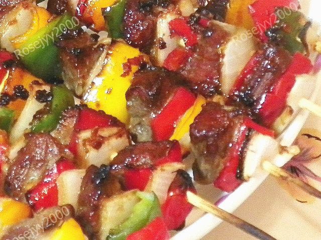 六、刷上兑好的涂汁,再把肉串转180度,再刷一遍,然后放在邓热好的烤箱里,400度F,约20分钟,再反转180度,再烤约10分钟,总之是要把牛肉蔬菜烤熟,但不要过火,牛肉熟即可。