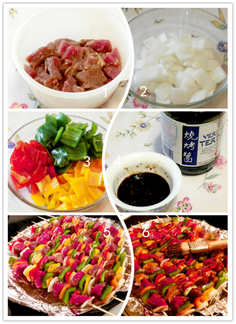 五、用竹签间隔地将牛肉粒、菜椒和洋葱串好;