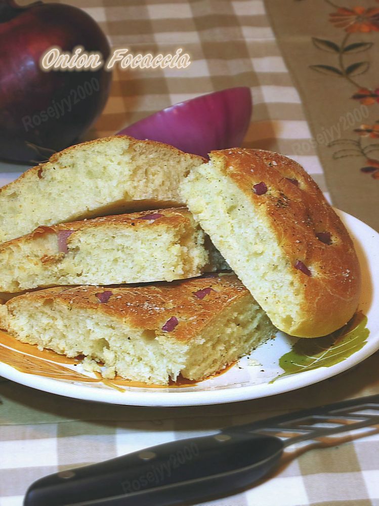 四、Focaccia 面上插的材料不一定是洋葱,也可以是蒜片、迷迭香、九层塔或黑橄榄片,本人比较偏向用蒜片和迷迭香,这次试用洋葱,效果也是不错的;