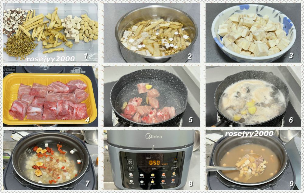 主料:猪骨约400克、粉葛约400克、党参约15小根、玉竹1把、土茯苓粒1/4杯、赤小豆1/4杯、扁豆1/4杯、苕实1/4杯、杞籽1把、红枣3粒、花生1/4杯。