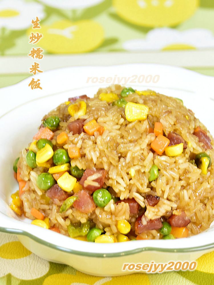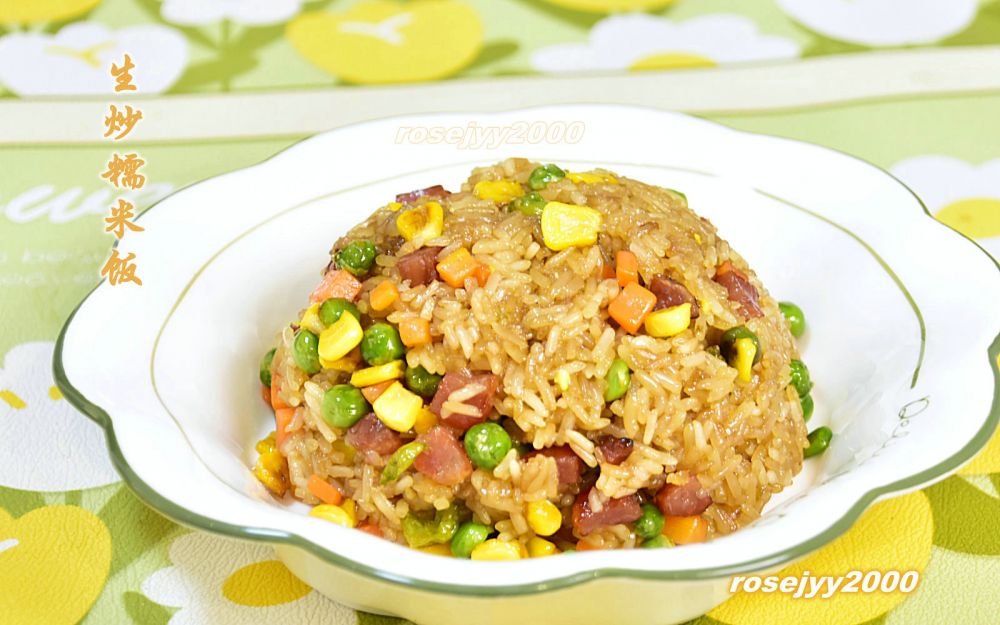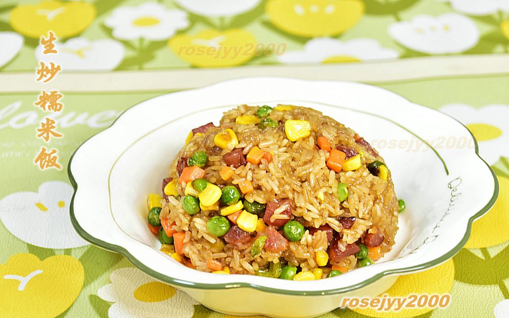 生炒糯米饭是广式经典,核心在于生米直炒、分次加水、粒粒分明,油香腊味十足,暖胃又顶饱。也有些人认为是家常快手版,家常说得对,但快手就不一定了。您想想,为了炒它,隔晚要泡米,到炒时要把生米炒生熟饭,不是翻几下铲就能做好的,要分数次加水,广东人称为洒水,水又不能过多,又要把糯米炒到粒粒分明而又不可夹生,严格来说是耐心饭功夫饭。
