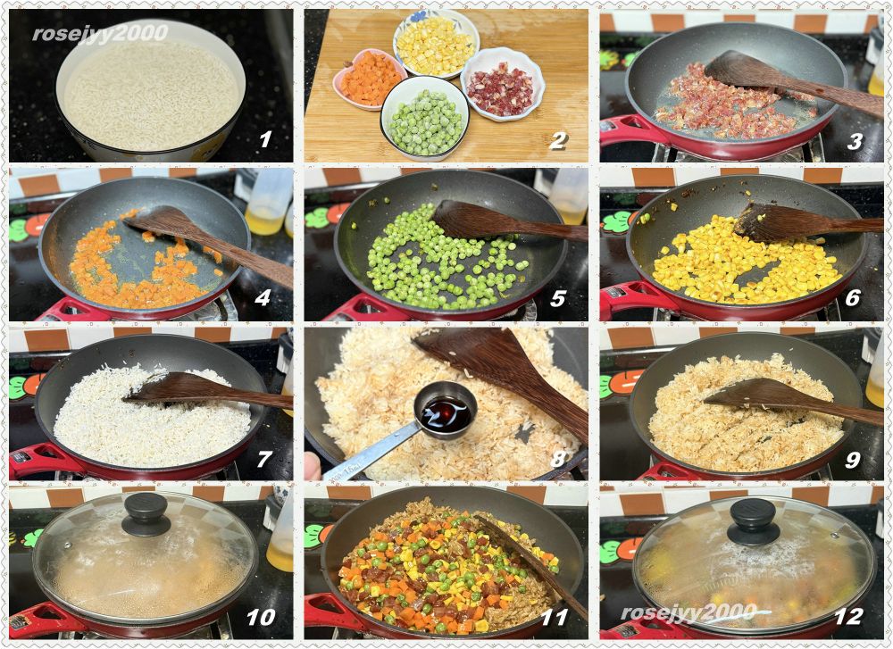 主料:电饭煲量杯2杯、腊肠粒3条量、青豆1/2杯、玉米1/2杯、红萝卜粒1/4杯。