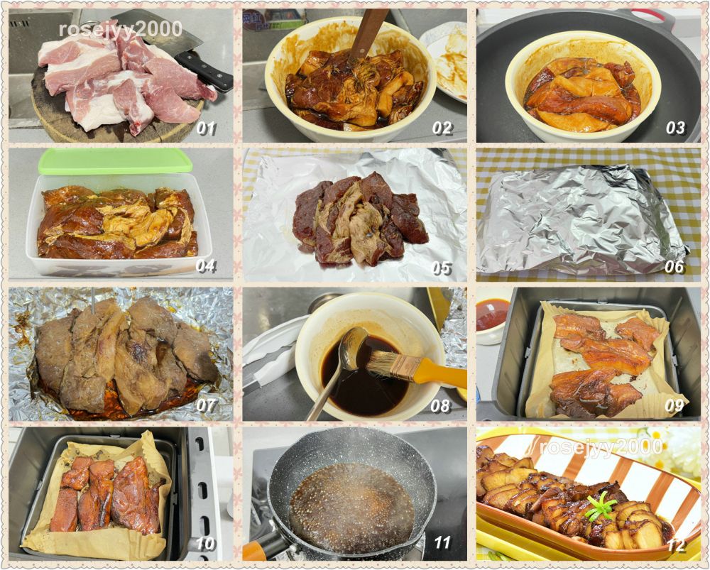 腌料:李锦记叉烧酱2大勺、玫瑰露1大勺、生抽1.5大勺、老抽1/2大勺、胡椒粉1/2小勺。