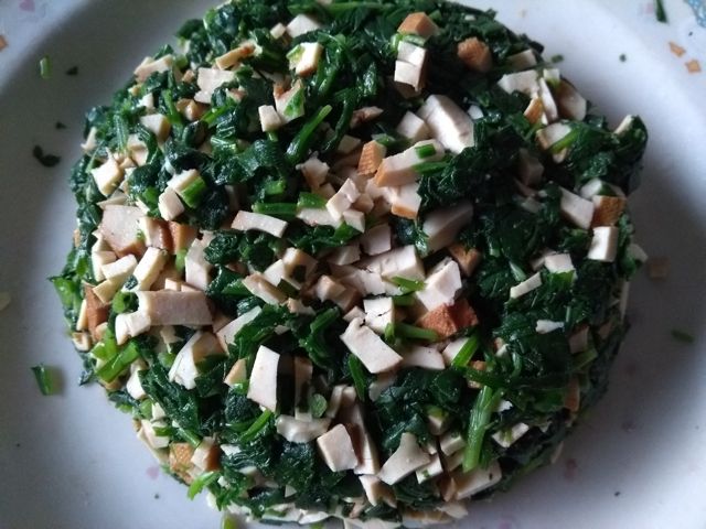 加盐,五香粉,糖,一点点鸡精,麻油,拌入香干和马兰头,装盘。