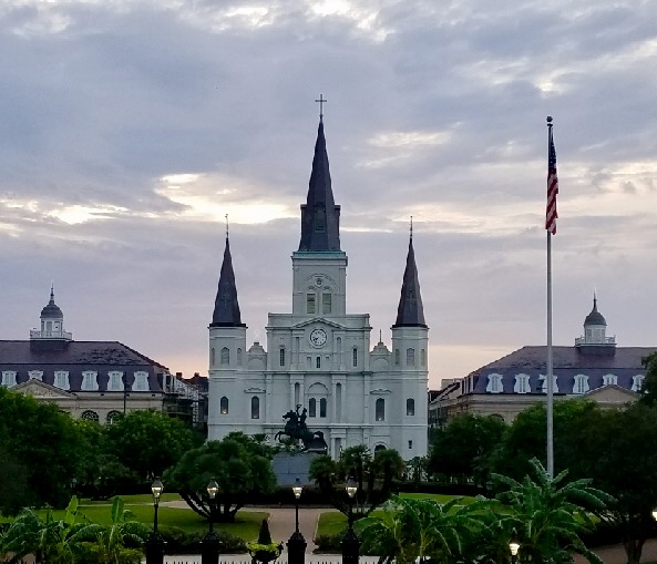 新奥尔良安德鲁·杰克逊广场和圣路易斯大教堂,杰克逊是美国第七任美国总统,新奥尔良战役英雄。教堂左侧建筑是市政厅,著名的路易斯安娜购地协议在此签订。