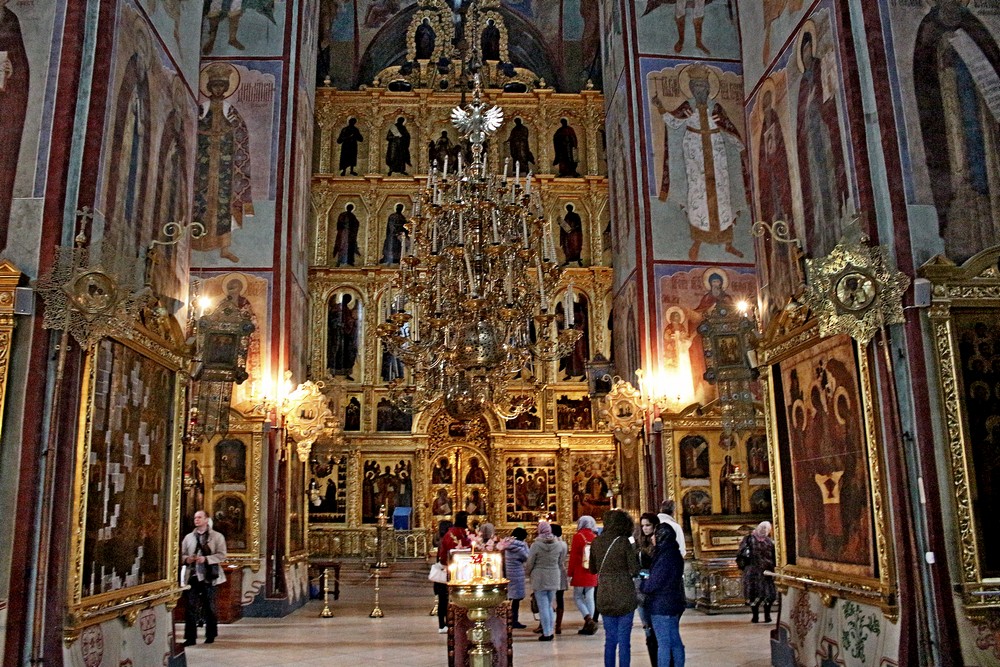 大修道院中央有个圣母升天大教堂(Cathedral of the Assumption),是伊凡雷帝(Ivan the Terrible)建造的,始于1559年,26年后完成。它是俄罗斯东正教的中心和圣地。教堂从名字到结构都模仿了莫斯科克里姆林宫内的圣母升天大教堂,却比莫斯科的要大很多。在4个洋葱头形的蓝色圆顶中央,有一个金色的大圆顶,使它看起来有点像王宫。教堂内的装潢十分讲究,16至18世纪圣象画家大师的杰作,紫色蓝色紫罗兰色的壁画,最后的晚餐的图案,等等,琳琅满目。
