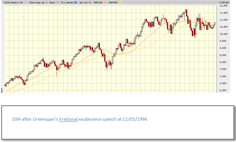 1996年格林斯潘提起Irrational exuberance的时候,道指6000. 随后四年double. "Don't fight the FED" 在个股判断上不适用。且行且加仓。 rn rnYMYD rn rn