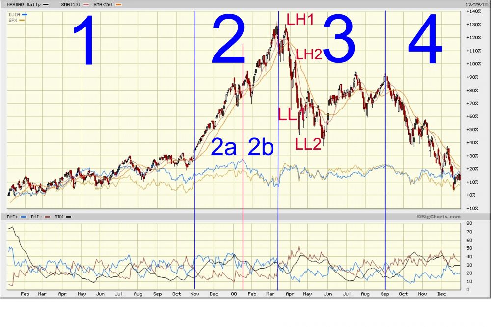 诞生阶段(1999年11月至2000年3月),那指突然加速非涨,短短两个月涨幅远远超过之前一年。起初两个月大市全面加速上扬。至2000年1月4日,SPX一年涨幅达到20%,DJIA一年涨幅达到25%,而那指一年涨幅达到90%。