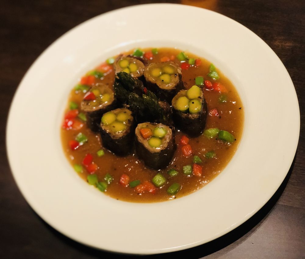 来自上海国际饭店的朱师傅竭力推荐牛柳卷芦笋, 就是一款西化中餐。取材简洁:牛柳,芦笋。