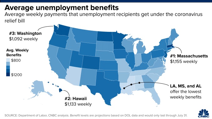 出租房稍有影响,餐馆则是重灾区了。参与投资的几家餐馆共有七百多座,全部停止营业。部分营业的外卖外送,杯水车薪,只是略有弥补。就这样也是左支右拙,很难留住员工。毋庸置疑,人人珍惜生命,离职避疫无可厚非。另一方面,麻州不错的失业保险政策,加上联邦每周补贴600元,在一定程度上影响了一部分员工的工作动力。有时候失业可以获得比上班更好的收入(见图)。