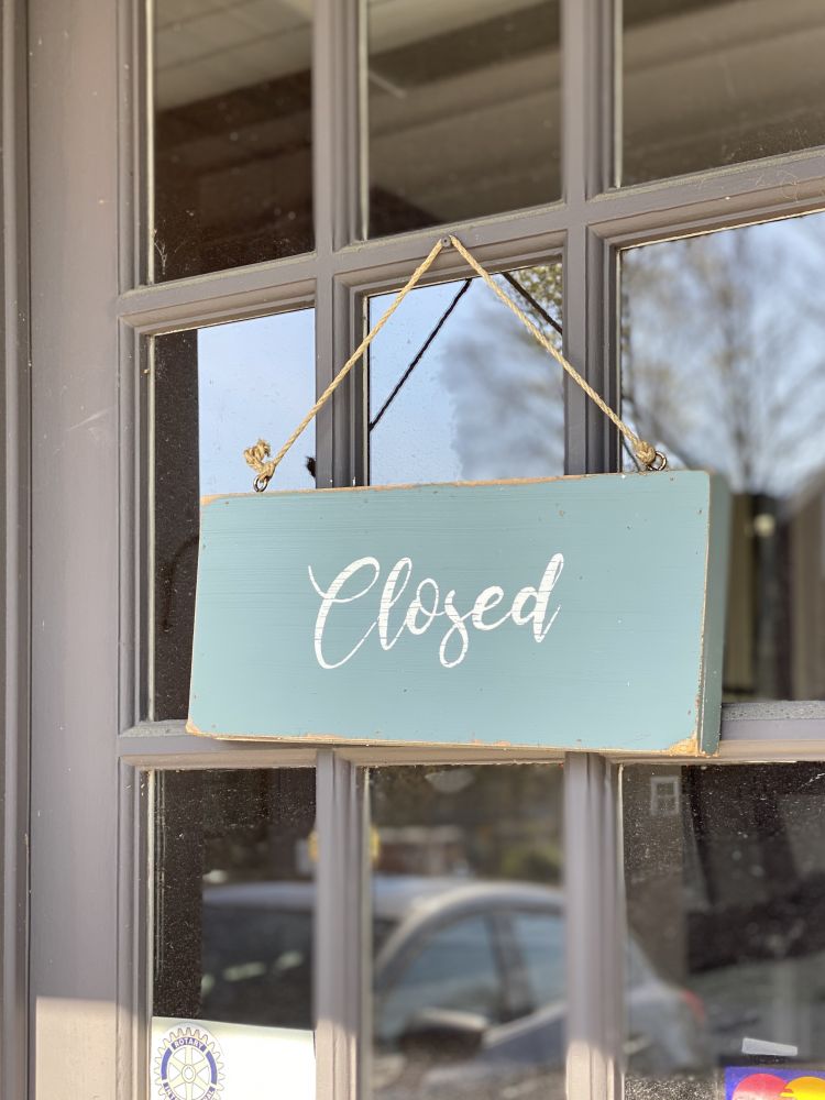 不一会来到小镇中心,教堂也改到线上活动,门可罗雀。有些小店掛上"停止营业“的牌子,餐馆则掛上“仅限外卖”的告示。