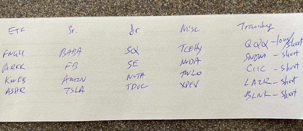 我有五个美股帐户,包括IRA帐号,一般帐号。全部股票可以随时在一个信封上写出。我的持仓由ETF,成熟成长股,高速成长股,杂类,交易类共五类。写下来如图所示 (今日),一目了然。