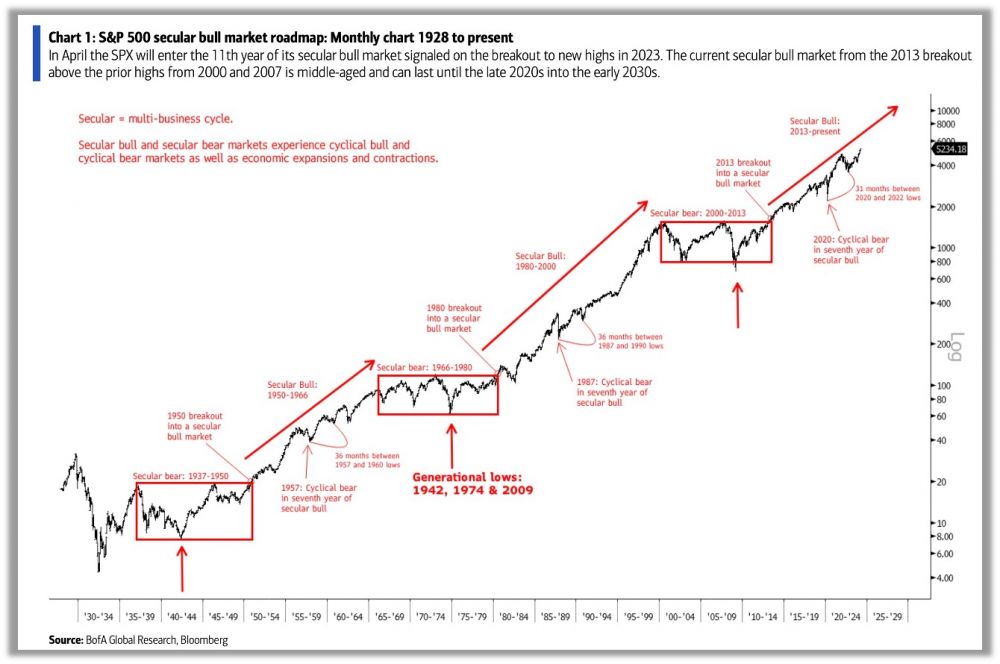 代际牛市 secular bull market,指20年左右的大趋势。如1950、1960年代,1980、1990年代,与2010、2020 年代。代际牛市之中会出现几次技术熊市,但要么跌幅不深,要么时间不长。比如最近的2018年第四季度、2020年的三月以及2022年,每次都从技术上(定义大市从高点回撤幅度超过20%)进入熊市,但由于时间短或者幅度不大,恢复起来相对容易。每一个代际牛市背后都是生产力水平的飞跃,会有一系列的事件此起彼伏的爆发。
