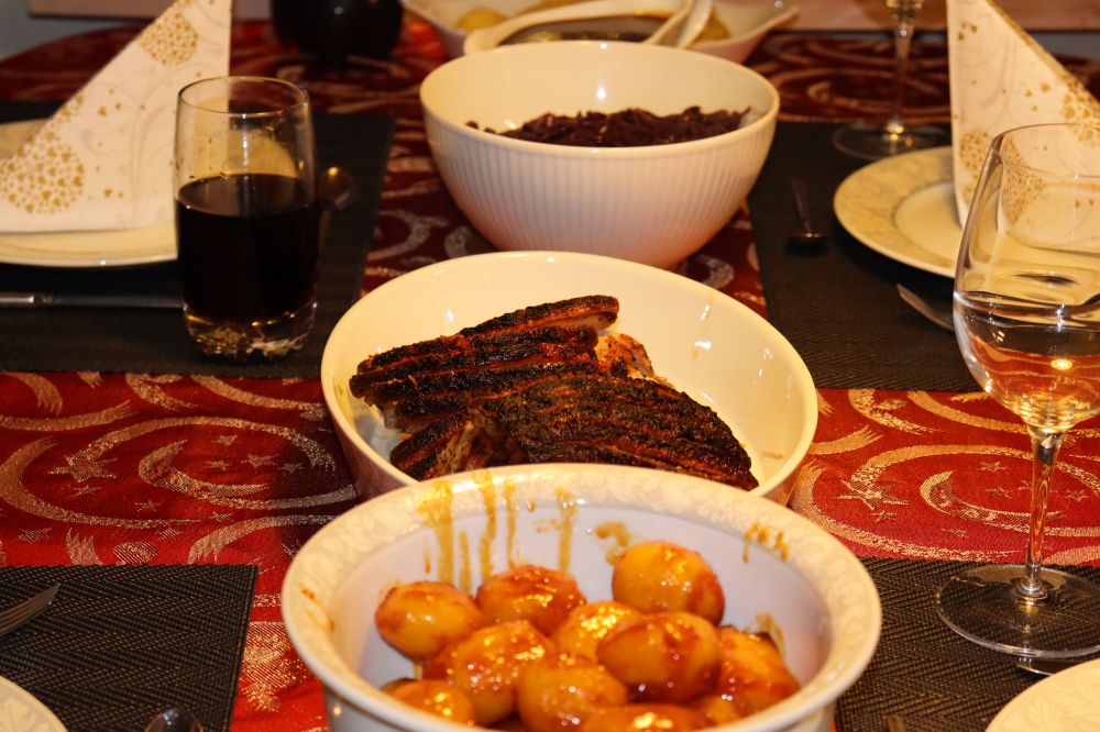 丹麦的平安夜是12 月24日,我家的圣诞大餐是烤猪肉,糖炒土豆,肉汁配chips,甜品是Risalamande配樱桃酱.