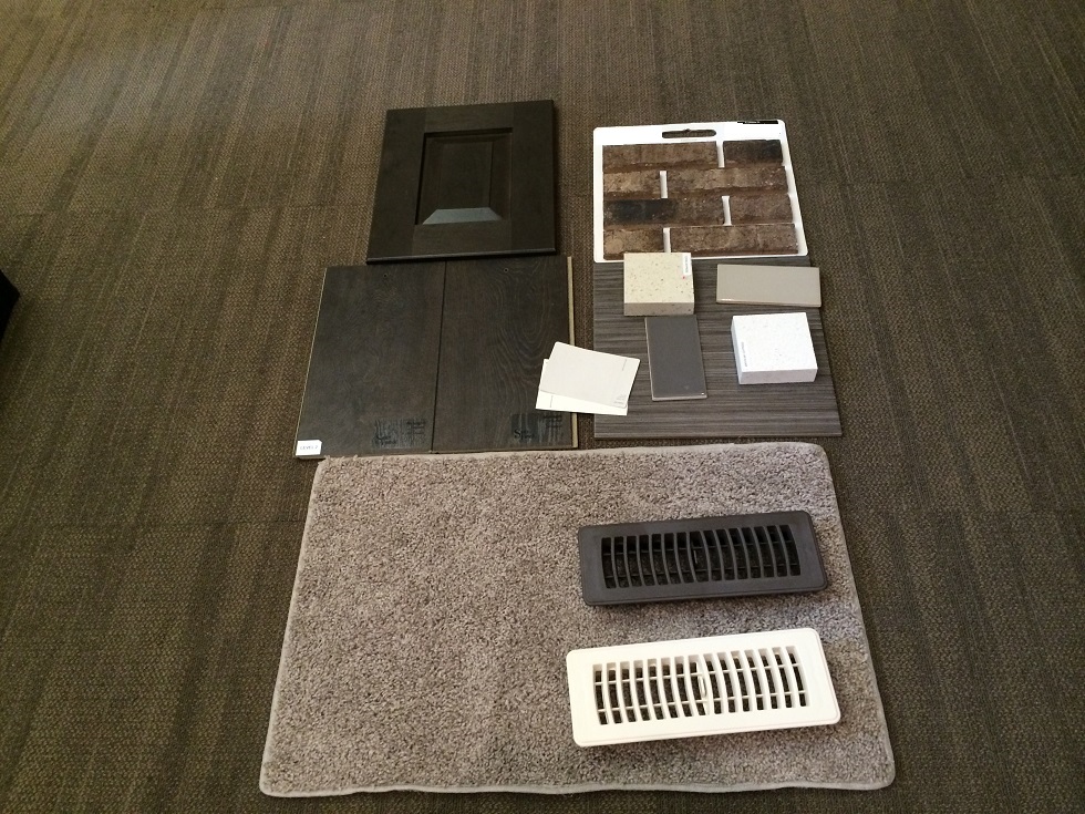 室内材质与颜色的选择,厨房的墙砖也是贴红砖片,包括餐厅、客厅壁炉墙等。地板上的两张色卡纸浅灰色是墙体色,乳白是墙角线色,米黄色大理石是厨房台面和主卧洗手间,乳白色是次卧洗手间台面颜色。所有橱柜都是左上角的质地和颜色。地板不满意,但实木地板实在选不出更适合搭配其他材质颜色的,凑合吧: