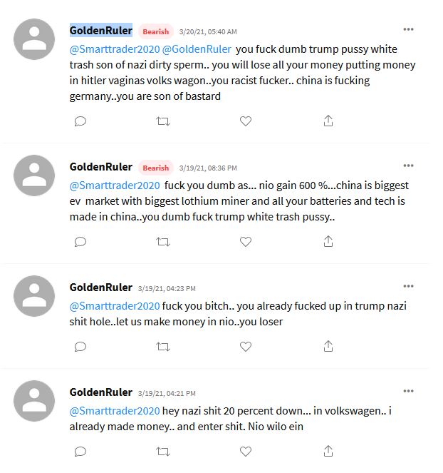 我是某985毕业的EE和CS的本硕,有20多年电子和计算机的工作经验包括EV,有时会在网上评论一下科技相关的股票,对中国所有的EV股票都是支持的,唯独蔚来,看空这家皮包公司是有理有据的,不再这里赘述。网上遭遇一个蔚来的股东,把我当白人了,被劈头盖脸的一通骂,语言极其污秽和傲慢,试想如果我是一个白人遇到这种中国战狼,会有什么反应?我不是说华人在美国遭[