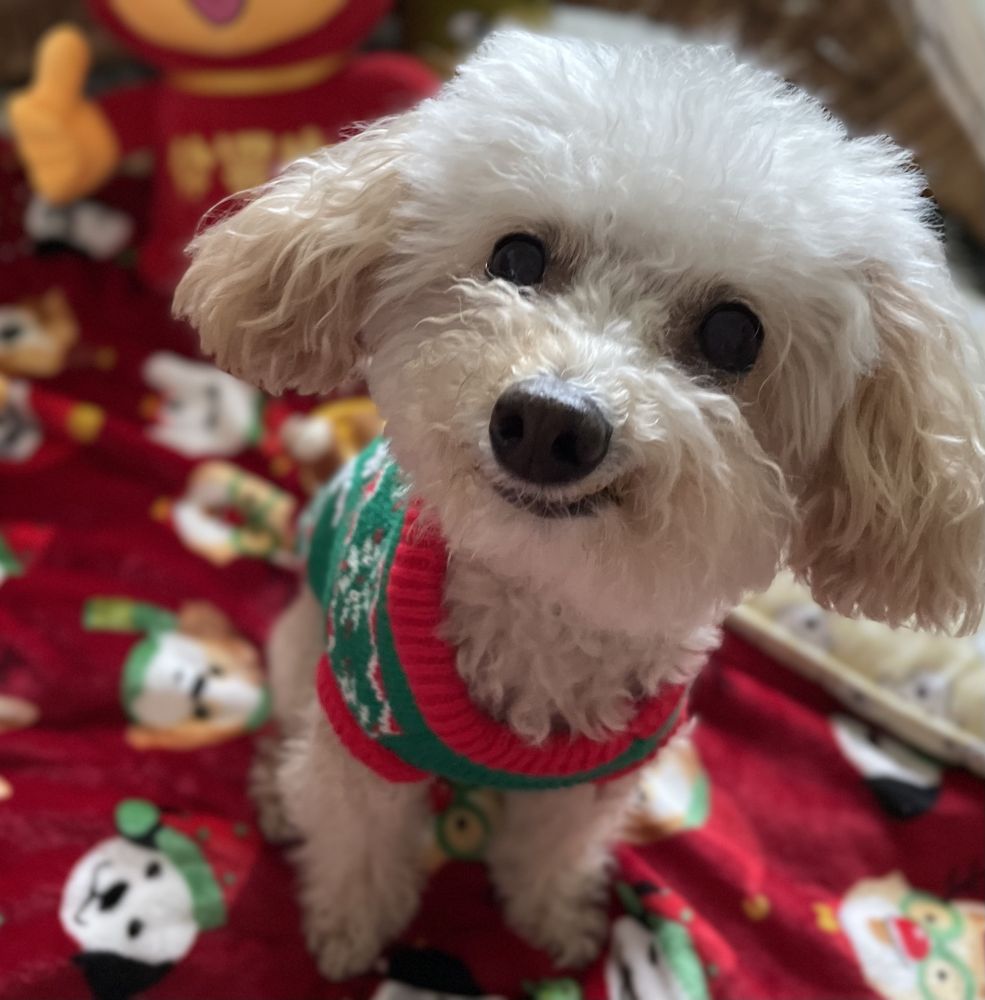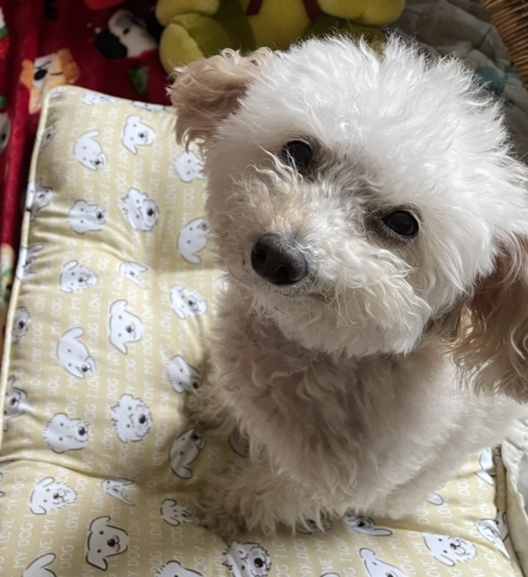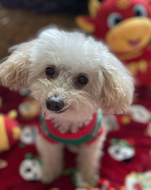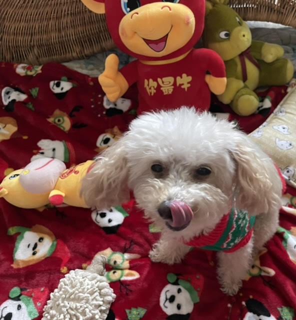 财宝是mini poodle,只有8磅。她的原主人说她的牙动过手术,她只有三棵牙。所以有的treat和某些食物,我都剪成小块给她。