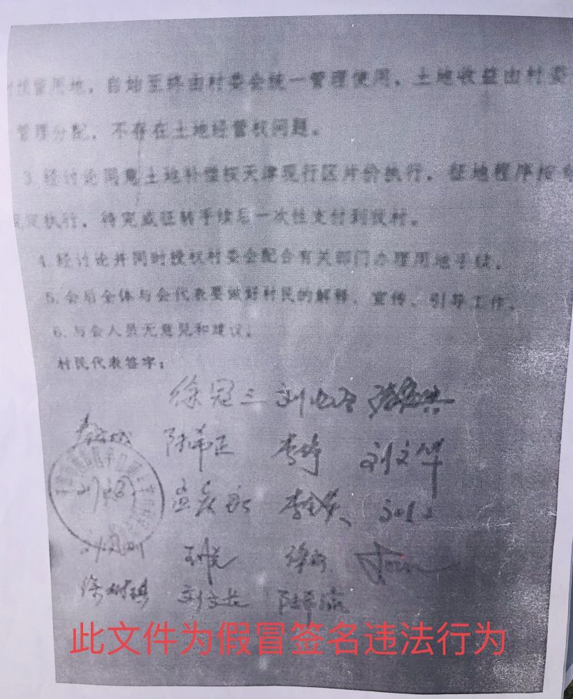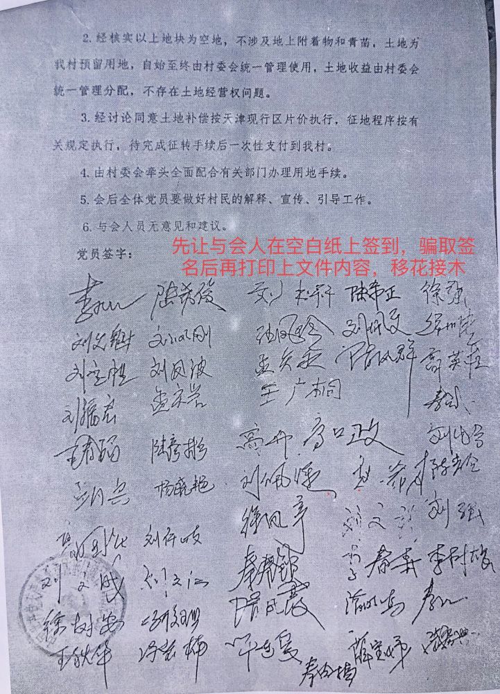 在国家严令要保护村民宅基地和土地权利前提下,某些村领导知道广大村民已经产生了维权意识,为了私下达到盗卖集体财产的目的,在会议记录伪造村民代表签字,还有在出席人员不知情的情况下,移花接木,把签到表上打印文件内容,造成村民代表同意的造假行为。已经有多位党员代表签名证明这个违法行为。