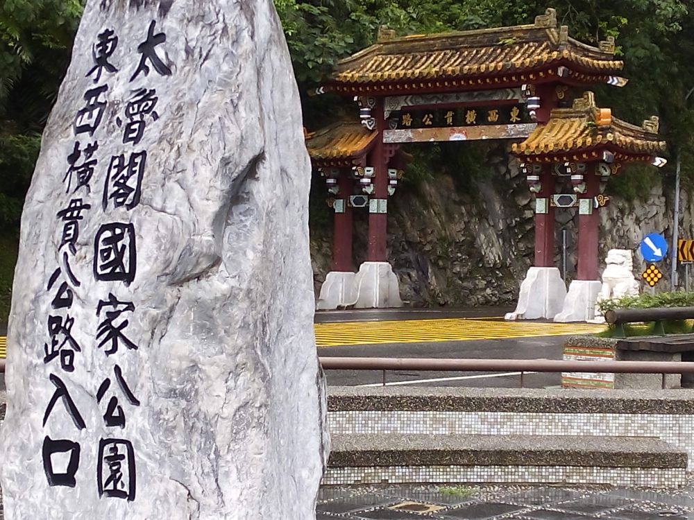 午餐后我们就回程了。途经长春祠。资料说因工程意外及天灾而殉难的有212人,受伤者702人,平均下来每公里牺牲1人余。当时的台湾省公路局为了告慰英灵,于是在1958年,择定公路对岸的涌泉水瀑上方筑祠 此时老天又开始下雨。我们打着雨伞穿洞前去。不料半途看到路因塌方已关闭。灵位供奉位置变更为步道入口旁的三圣佛弥陀岩。上车后不久就来到太魯閣公园的正门。拍了几张照片留念。结束了太鲁阁之行。